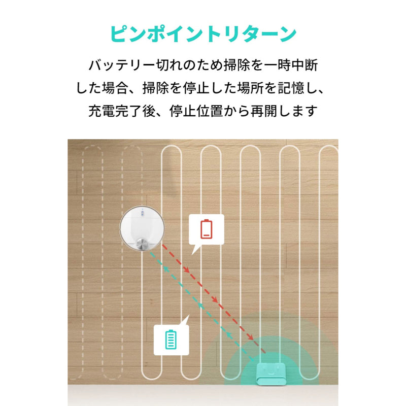 バッテリーの残量が少なくなり掃除を一時中断した場合、中断した位置を正確に記憶します。充電ステーションで充電を完了した後に、その位置から掃除を再開します。