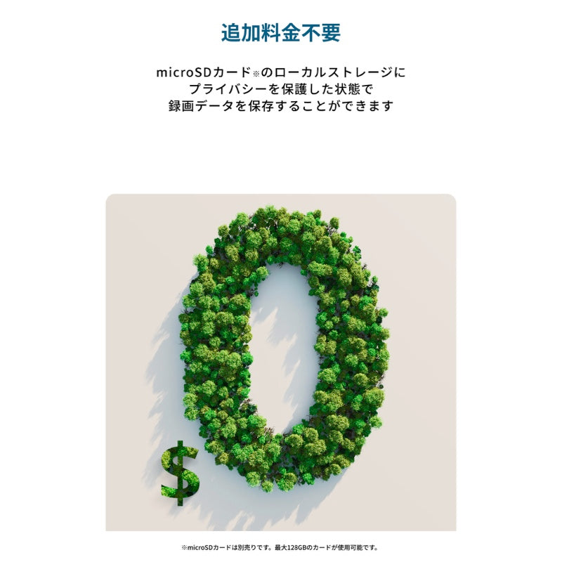 microSDカード※のローカルストレージに、プライバシーを保護した状態で録画データを保存することができます。※microSDカードは別売りです。最大128GBのカードが使用可能です。
