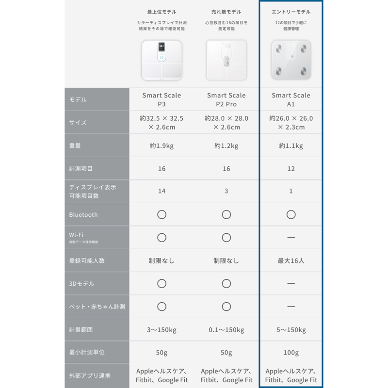 | 赤ちゃん / ペットの体重測定モード | - | ◯ | ◯ | - |