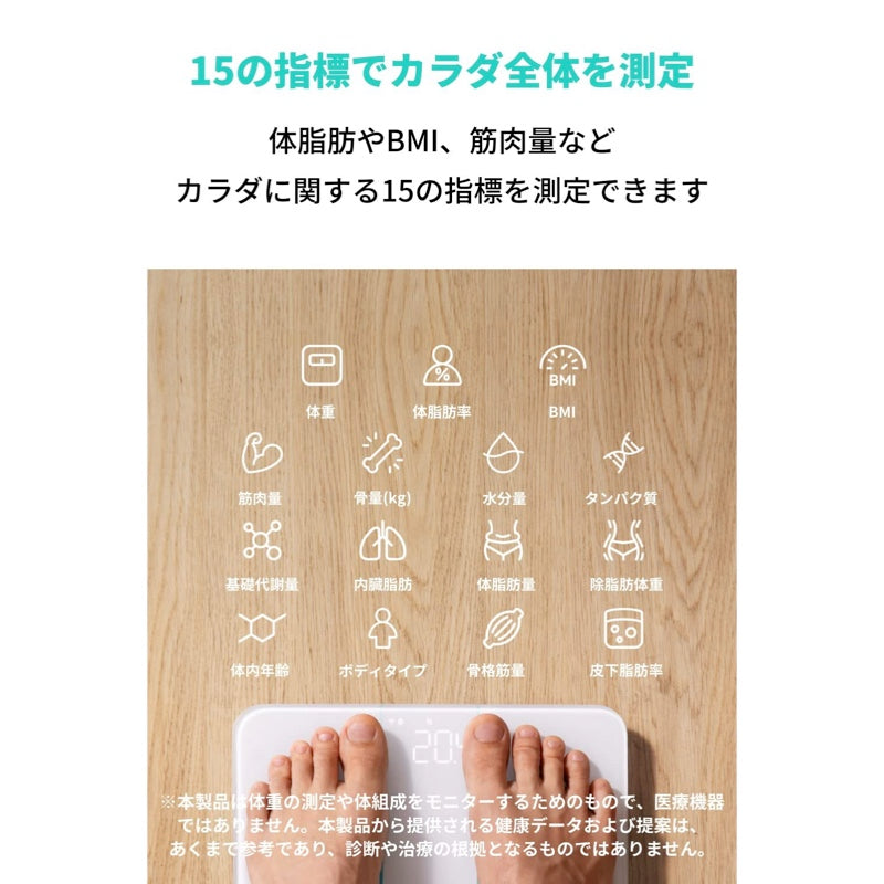 | パッケージ内容 | Smart Scale P2、単4形アルカリ乾電池x4本、取扱説明書、測定テープ、18ヶ月保証 + 6ヶ月 (Ankerで会員登録後) 、カスタマーサポート | ||||||