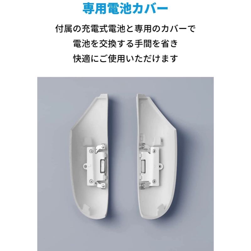 付属の充電式電池と専用のカバーを併用することで、カバーを外して電池を交換する手間を省き、快適に充電可能です。充電式電池