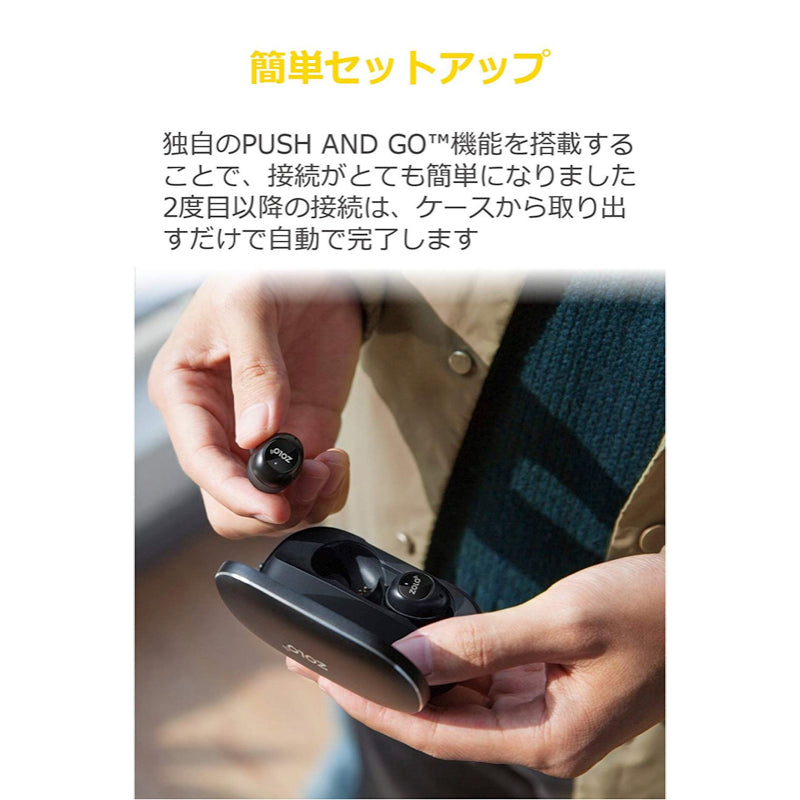 PUSH AND GO機能により、これまでにない快適なペアリング体験を可能にします。お使いのスマートフォンのBluetooth設定から一度Zolo Liberty+を接続すると、充電ケースから取り出すたびに自動で接続し、充電ケースに戻せば接続を解除します。