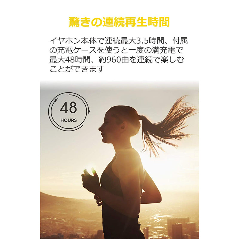 イヤホン本体がフル充電された状態で最大3.5時間の連続再生ができ、さらに充電ケースを使用すれば、最大48時間まで使用可能です。充電ケーブルを持ち運ぶ必要もなく、毎日の充電から解放されます。