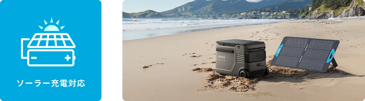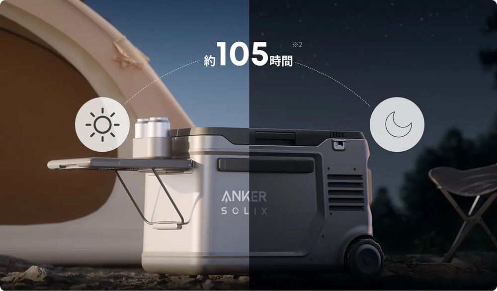 別売りの交換用バッテリーと併用することで最長約105時間※2と4日間以上、冷やし続けることが可能です。さらに、ソーラーパネルから給電することで、電源の無い場所でもバッテリーをより長持ちさせることが可能です。