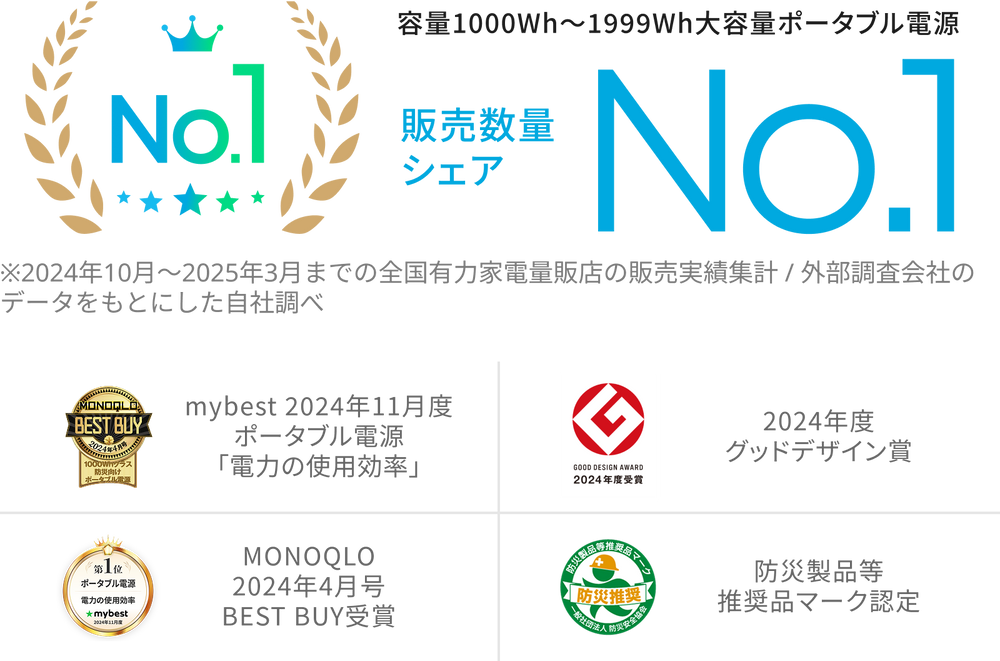 - ACコンセント (1500W) / ソーラーパネル (2400W) / 車のシガーソケット (120W) / EV充電スタンド (3000W)