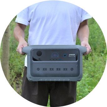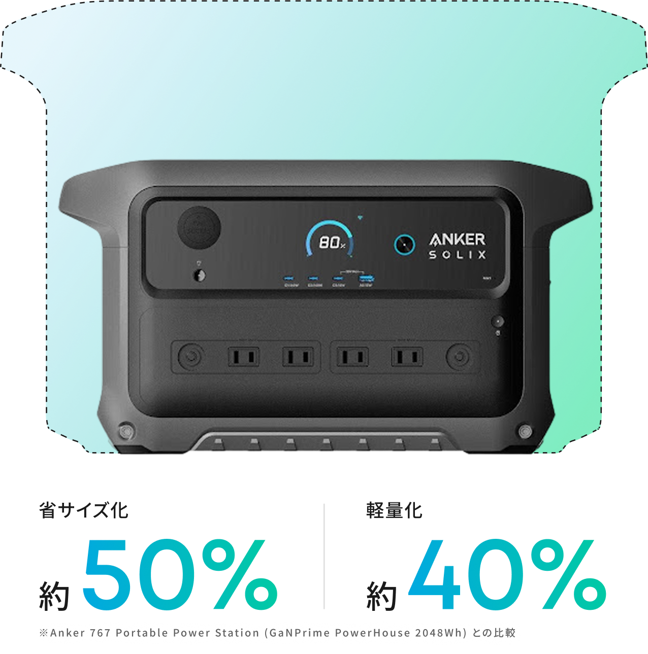 - 容量2000Wh帯のリン酸鉄リチウムイオン電池搭載モデルにおいて。ハンドル部分を除く体積計算に基づく (2025年9月時点 Anker調べ)