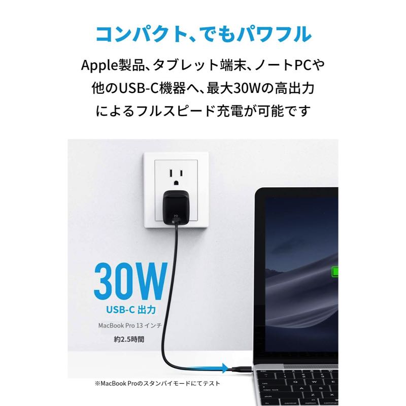 iPhoneなど最新のスマートフォンにわずか30分の充電時間で最大50%まで充電でき、USB-C対応ノートPCへは最大30W出力によるフルスピード充電が可能です。新素材GaN (窒化ガリウム)採用