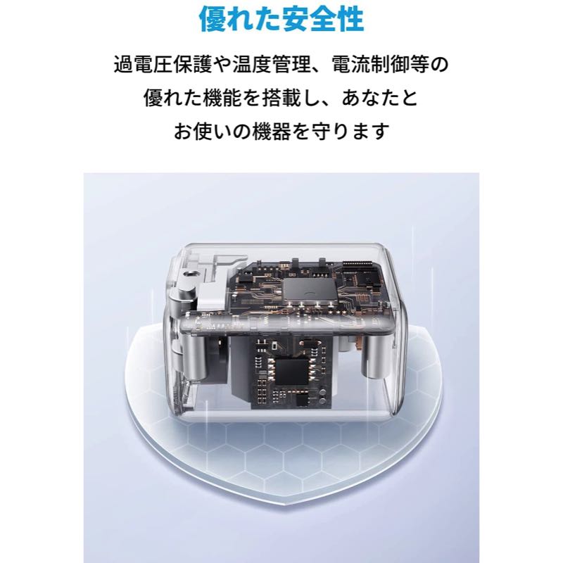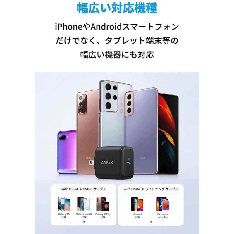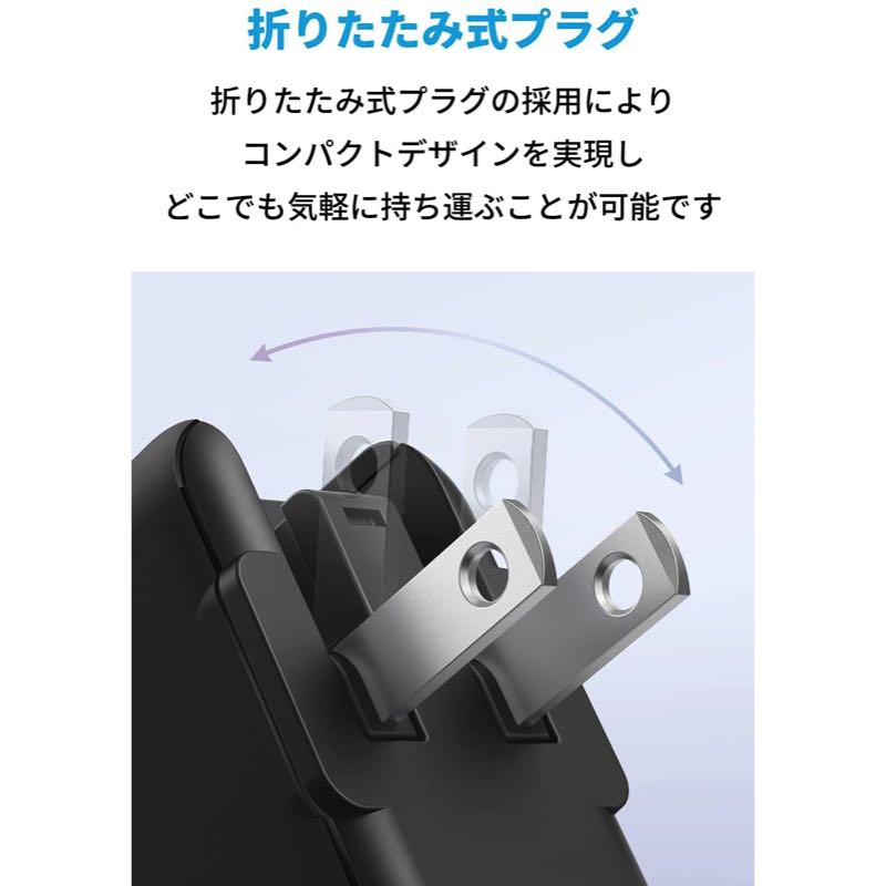 一般的な5W出力の充電器に比べ、最大3倍速く充電できます (iPhone 12を0%から30分充電した場合での比較) 。PDのオプションであるProgrammable Power Supply (PPS) 規格にも対応しておりGalaxy S21などPPS対応のスマートフォンへのフルスピード充電も可能です。折りたたみ式プラグ