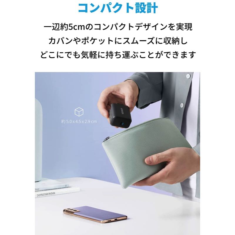 一辺約5cmのコンパクトデザインを実現。カバンやポケットにスムーズに収納し、どこにでも気軽に持ち運ぶことができます。幅広い対応機種