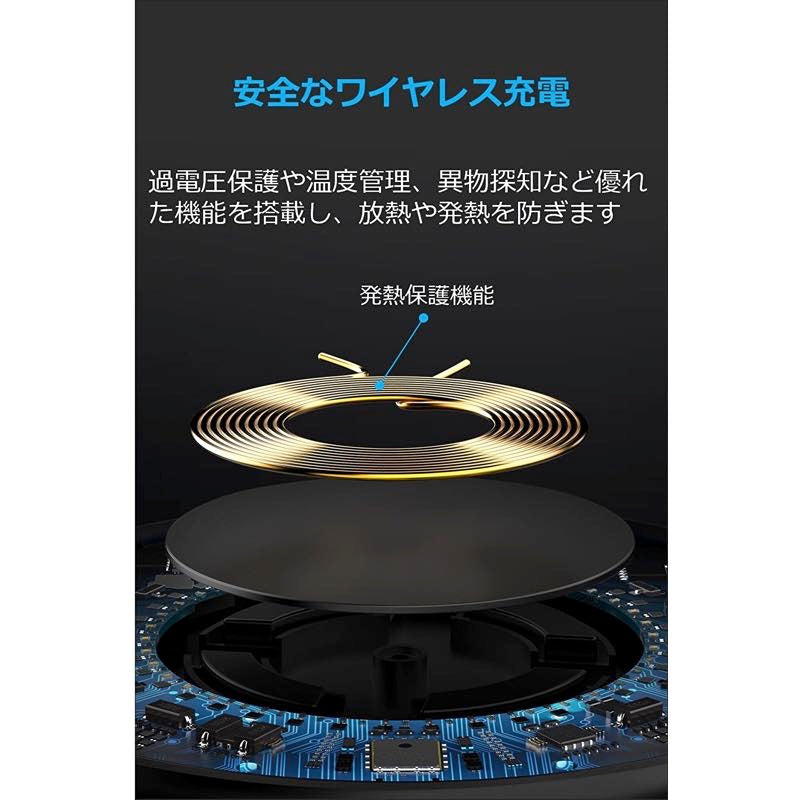 ワイヤレス充電器から発生する放熱や過熱リスクを最大限抑える設計にしました。CE、FCCおよびRoHSといった世界基準の認証を取得し、かつ温度管理技術搭載により安全な充電を実現します。製品仕様