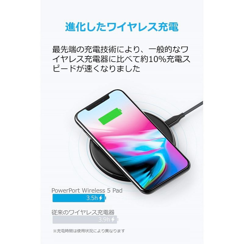 | パッケージ内容 | Anker PowerPort Wireless 5 Pad、0.9m Micro USBケーブル(ACアダプターは別売)取扱説明書、18ヶ月保証 + 6ヶ月 (Ankerで会員登録後)、カスタマーサポート |