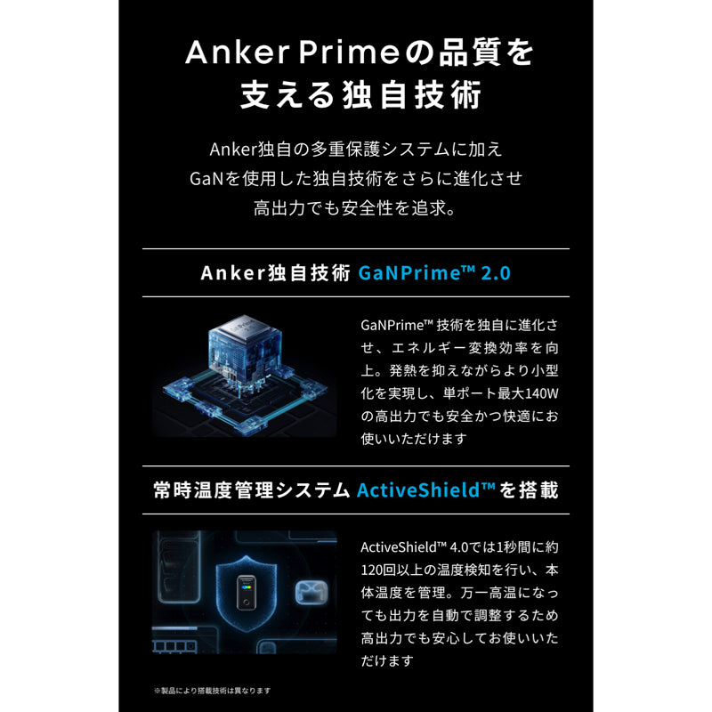 ・単ポート最大150Wでの出力はAnker プロトコルに対応したAnker Prime Power Bank (26250mAh, 300W)の充電時のみ対応します。その他の機器への最大出力は140Wになります。