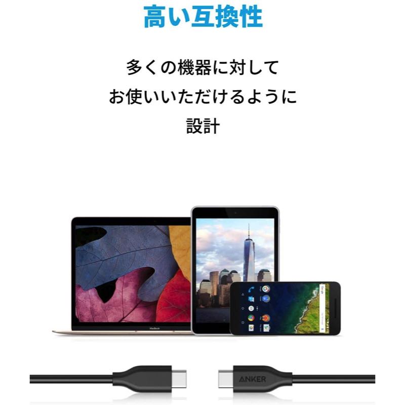 | パッケージ内容 | Anker PowerLine USB-C & USB-C 3.1 Gen 1、18ヶ月保証、カスタマーサポート |