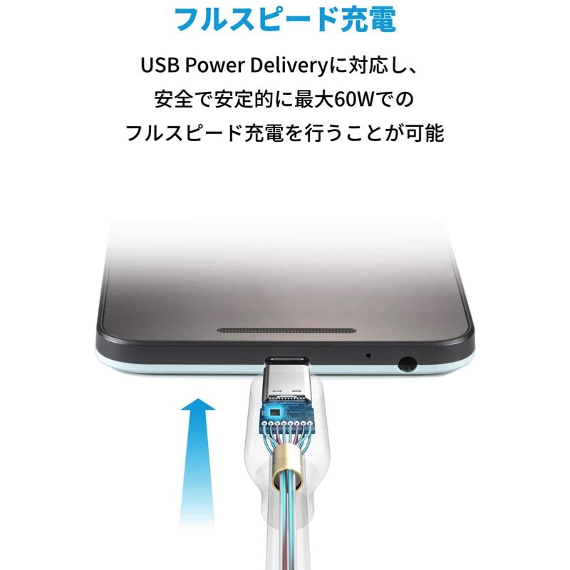 Power Deliveryに対応し、安全で安定的に最大60Wの出力を行うことが可能です。これにより、USB-C対応機器に今までにないスピードで充電を行うことが可能です。5Gbpsデータ転送