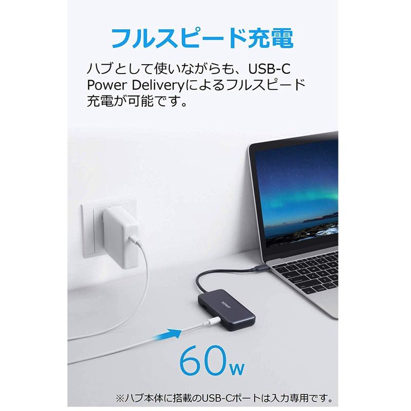 | ご注意 | ・別売りのUSB充電器を用いて、AC電源に接続してください。その際には、51.5W出力によるPCへの充電および8.5W出力によるハブへの給電が可能なPower Delivery対応充電器 (60W出力) をお使いください。 |