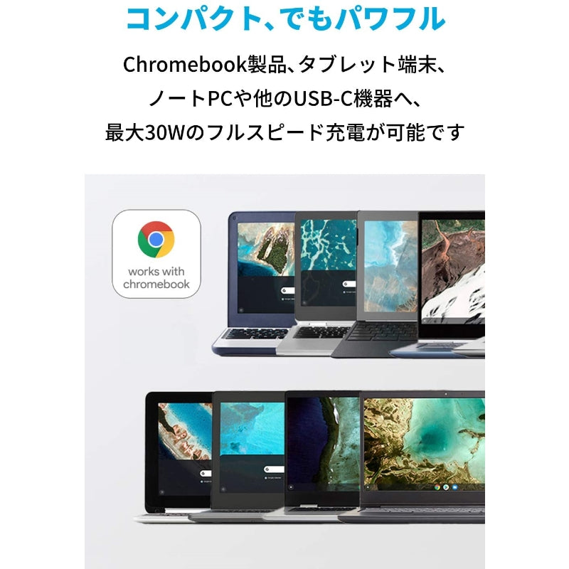 ノートPCを充電できる急速充電器をスマートフォン用充電器のサイズで実現しました。Apple製品やタブレット端末、Chromebook、その他Googleの端末へ最大30Wの高出力によるフルスピード充電が可能です。便利なケーブル付き