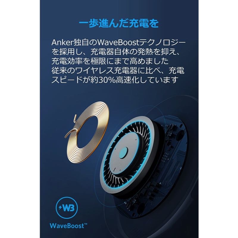 Anker独自のWaveBoostテクノロジーを採用し、充電器自体の発熱を抑え、充電効率を極限にまで高めました。従来のワイヤレス充電器に比べ、充電スピードが約30%高速化しています。最先端のワイヤレス充電技術