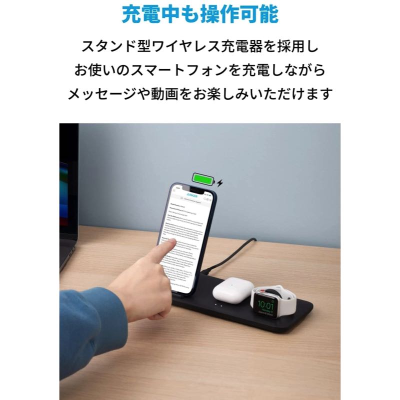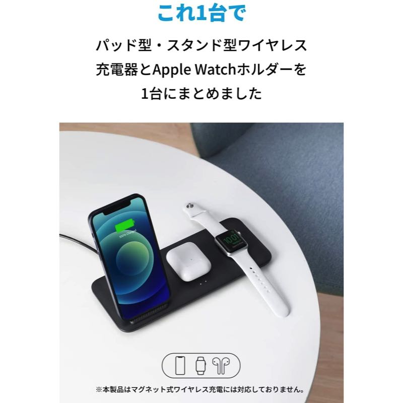 パッド型ワイヤレス充電器とスタンド型ワイヤレス充電器、Apple Watchホルダーを1台にまとめました。お使いのスマートフォンやワイヤレス充電対応のイヤホン、Apple Watchを3台同時に充電することが可能です (※Apple Watchホルダーをご利用の際は、純正のApple Watch磁気充電 - USB-Aケーブル (1m) (別売り) が必要です) 。あなたにピッタリの位置で