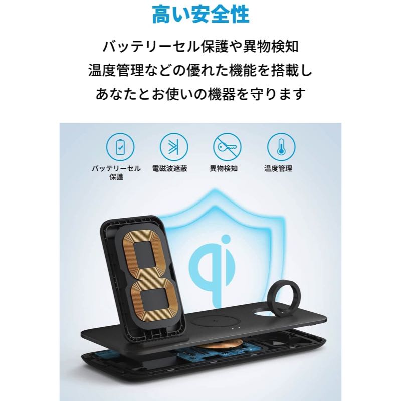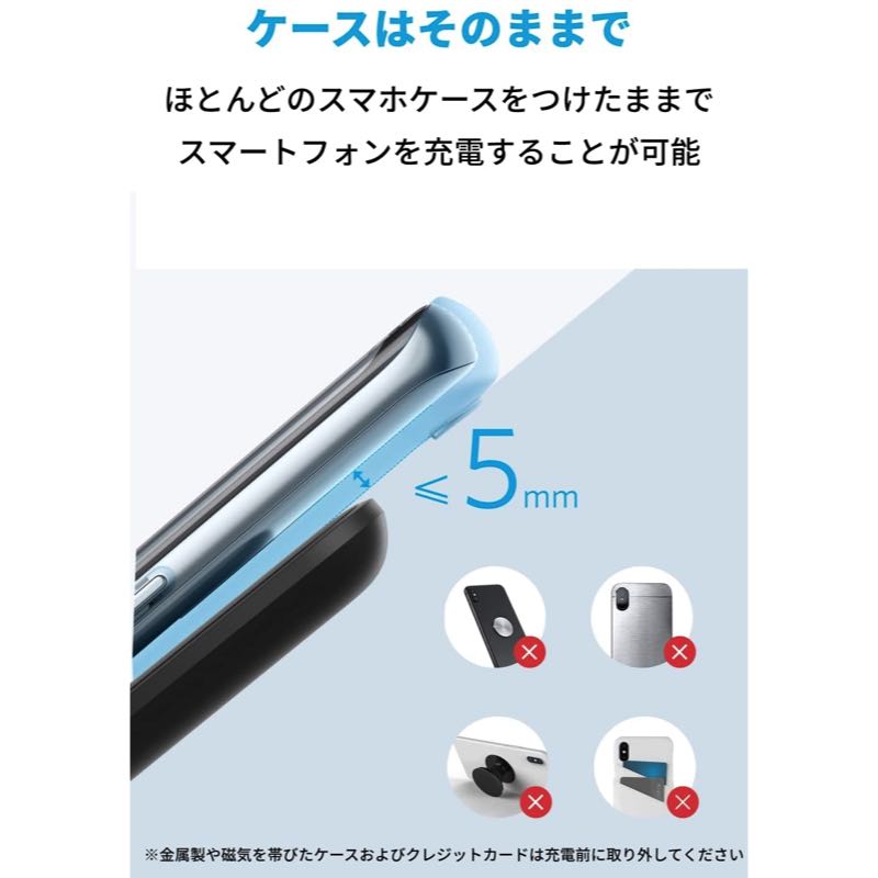 | ご注意 | ・Android携帯には最大11W、iPhone機器には7.5W、ワイヤレス充電対応のイヤホンには最大5Wの出力で充電が可能です。 |