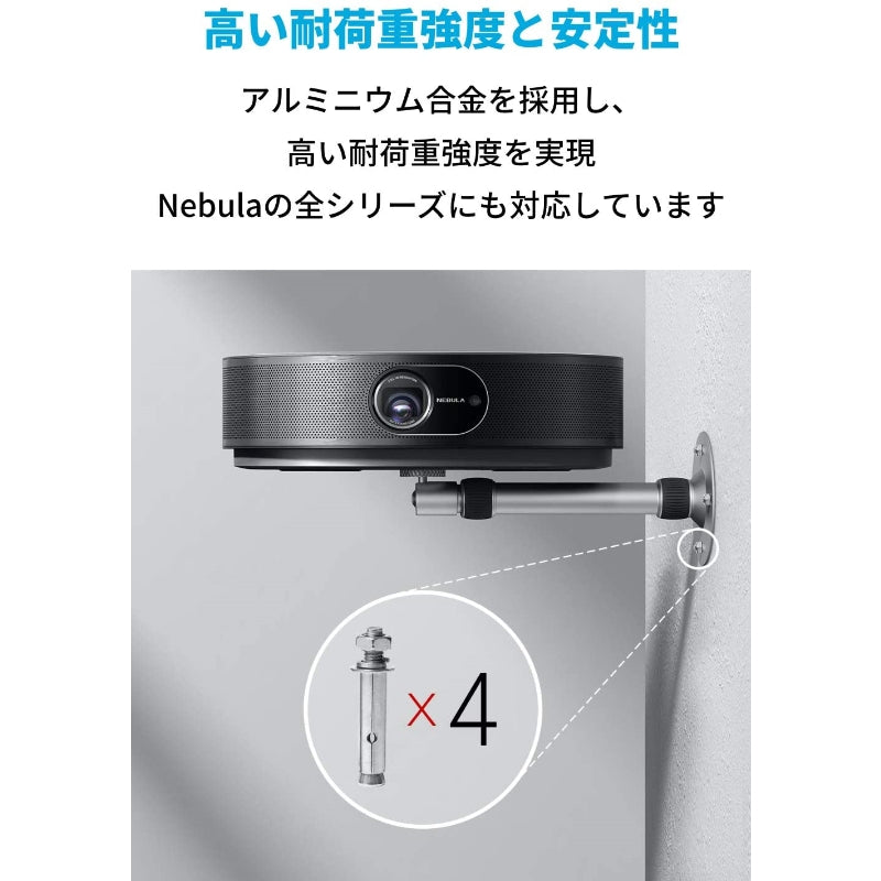 パッケージ内容 Anker Nebulaプロジェクターマウント、1/4インチサイズのネジ×4、取扱説明書、 18ヶ月保証 + 6ヵ月 (Ankerで会員登録後)、カスタマーサポート