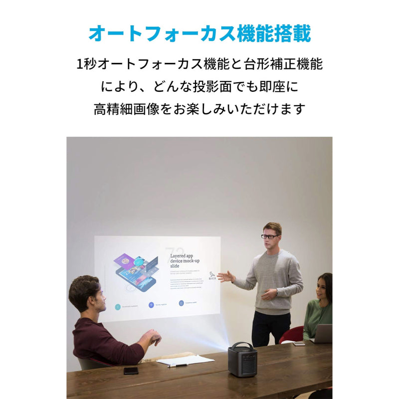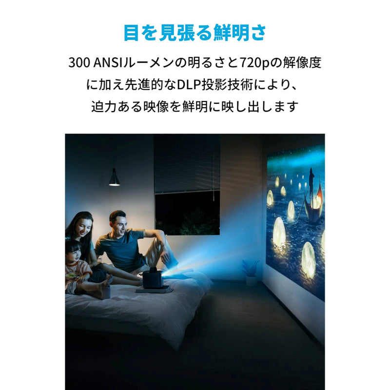 DLPの先進的な投影技術により、最⼤150インチの迫⼒の映像を300ANSIルーメンの明るさで鮮明に映し出します。また、1秒オートフォーカス機能で、瞬時に鮮明な画像を映し出します。Android 7.1搭載