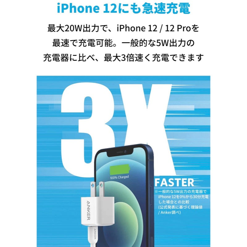 最大20W出力で、iPhone 12 / 12 Proを最速で充電可能。一般的な5W出力の充電器に比べ、最大3倍速く充電できます。※iPhone 12を0%から30分充電した場合との比較 (公式発表に基づく理論値 / Anker調べ)