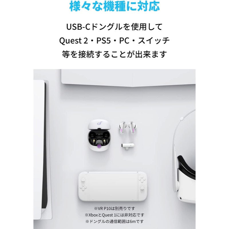 Soundcore VR P10完全ワイヤレスゲーミングイヤホン専用に作られたUSB-Cドングルを追加で購入することが可能です。専用アプリと複数のドングル (最大4つまで使用可能) を使用してQuest 2・PS5・PC等のゲーミングデバイス間を簡単に切り替えることができます。※Soundcore VR P10本体は本製品に含まれておりません。