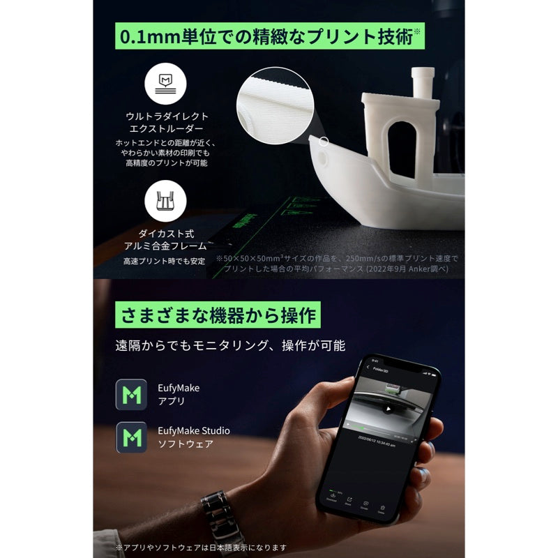 ※50 x 50 x 50mm³サイズの作品を、移動速度250mm/s、インフィル速度250mm/sでプリントした場合の平均パフォーマンス (2022年9月 Anker調べ)